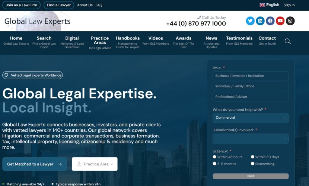 Global Law Experts (GLE) is an international legal network linking clients with pre-vetted law firms in over 140 jurisdictions. Although not a direct service provider, it acts as a curated platform for businesses needing local expertise in areas like VASP licensing and fintech compliance worldwide.