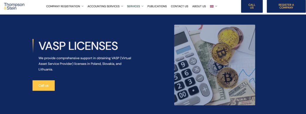 Thompson&Stein is a law firm specializing in obtaining VASP licenses within the EU, focusing on Poland, Slovakia, and Lithuania. They guide crypto companies to full compliance with local laws and MiCA, from company registration to post-license advisory.